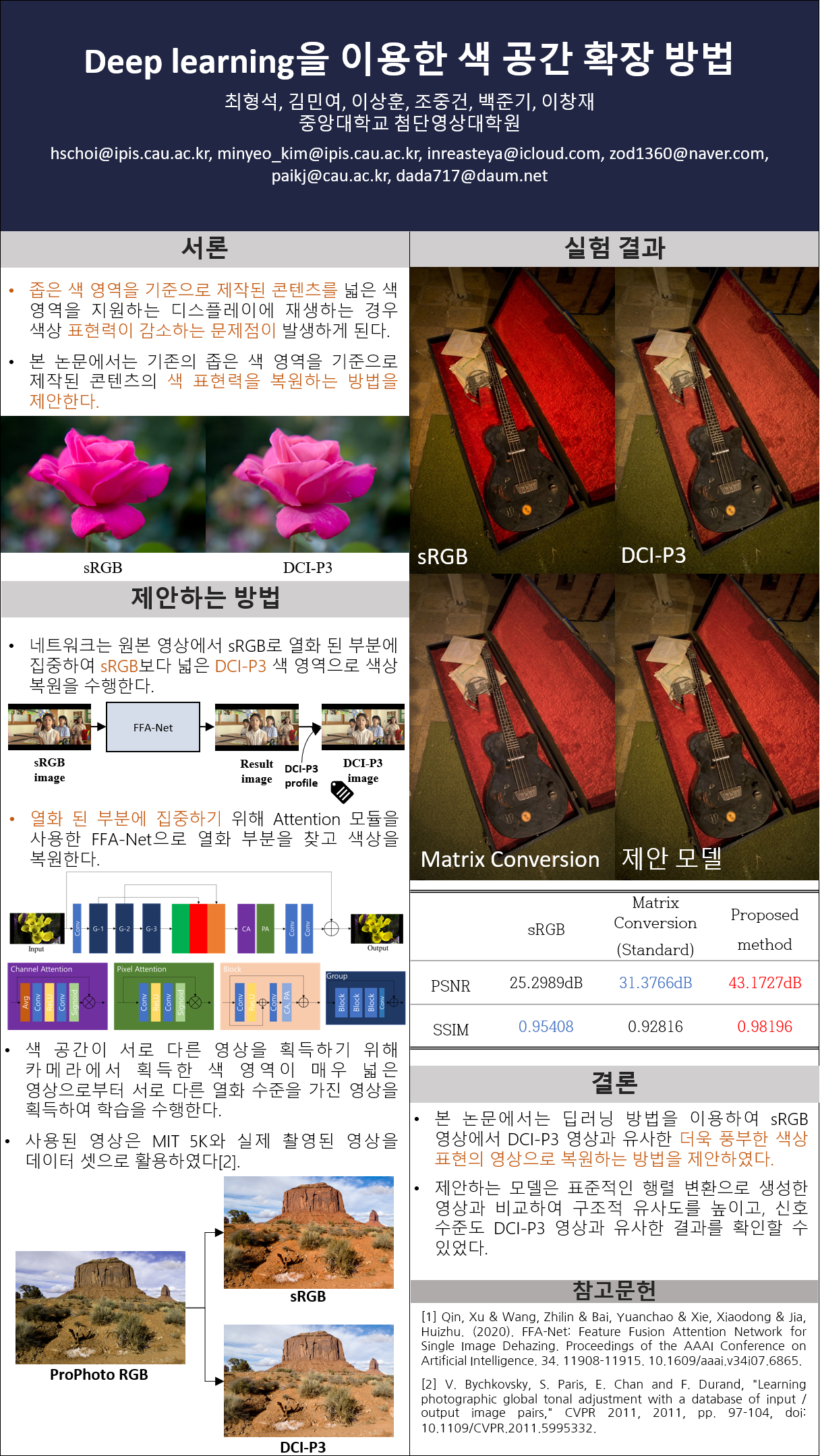 CFT 3팀저자 최형석은 수원대학교 정보통신공학과를 졸업하고, 중앙대학교 첨단영상대학원에서 영상공학디지털 이미징 전공으로 석사과정 재학 중이다. 주요 관심분야는 영상 개선 및 영상 복원으로서 현재 딥러닝 기반의 영상 안개 제거와 저조도 개선 연구를 진행하고 있다. / 저자 김민여는 서울과학기술대학교 전자IT미디어공학과를 졸업하고, 중앙대학교 첨단영상대학원에서 영상공학 디지털 이미징 전공으로 석사과정 재학 중이다. 주요 관심분야는 영상 복원 및 개선으로서 현재 딥러