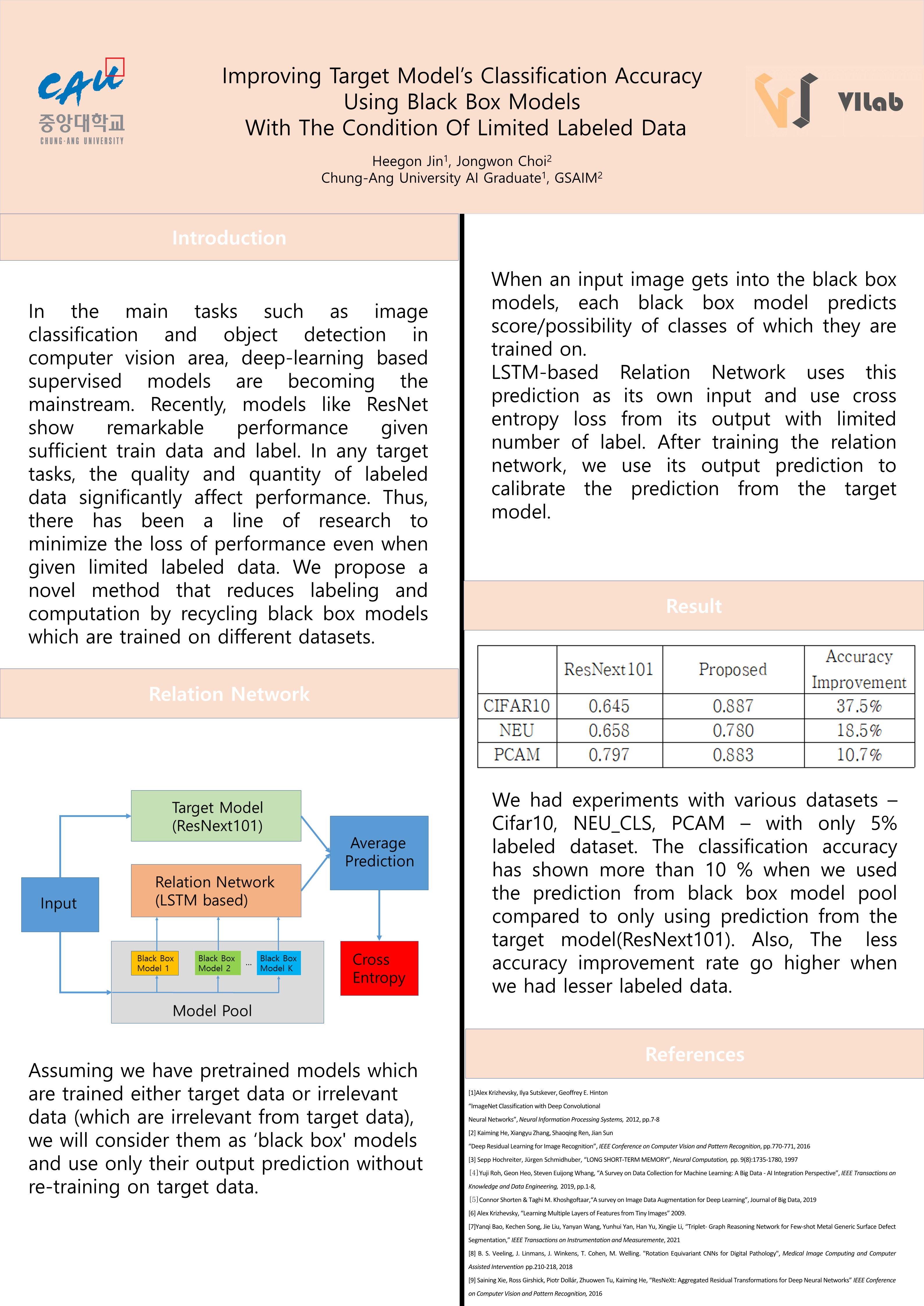 진희곤Heegon Jin is currently taking master's degree at Graduate School of Artificial Intelligence, Chung-Ang University. He is interested in machine learning, computer vision and knowledge distillation.