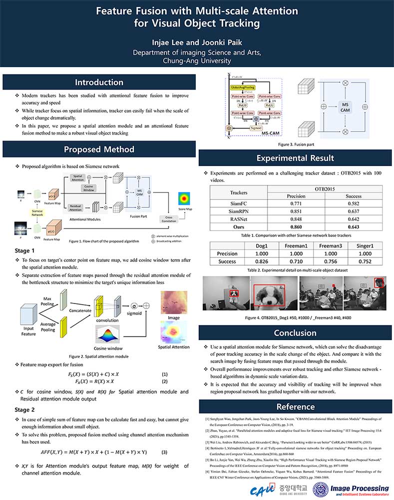 I am Injae Lee from Image processing and Intelligence System laboratory of Department of Imaging Science and Arts, Chung-Ang university. Graduated in electronic and electrical engineering of Chung-ang university. What I am interested in is Deep learning and Image processing. Specifically, visual object tracking is my main field of research.