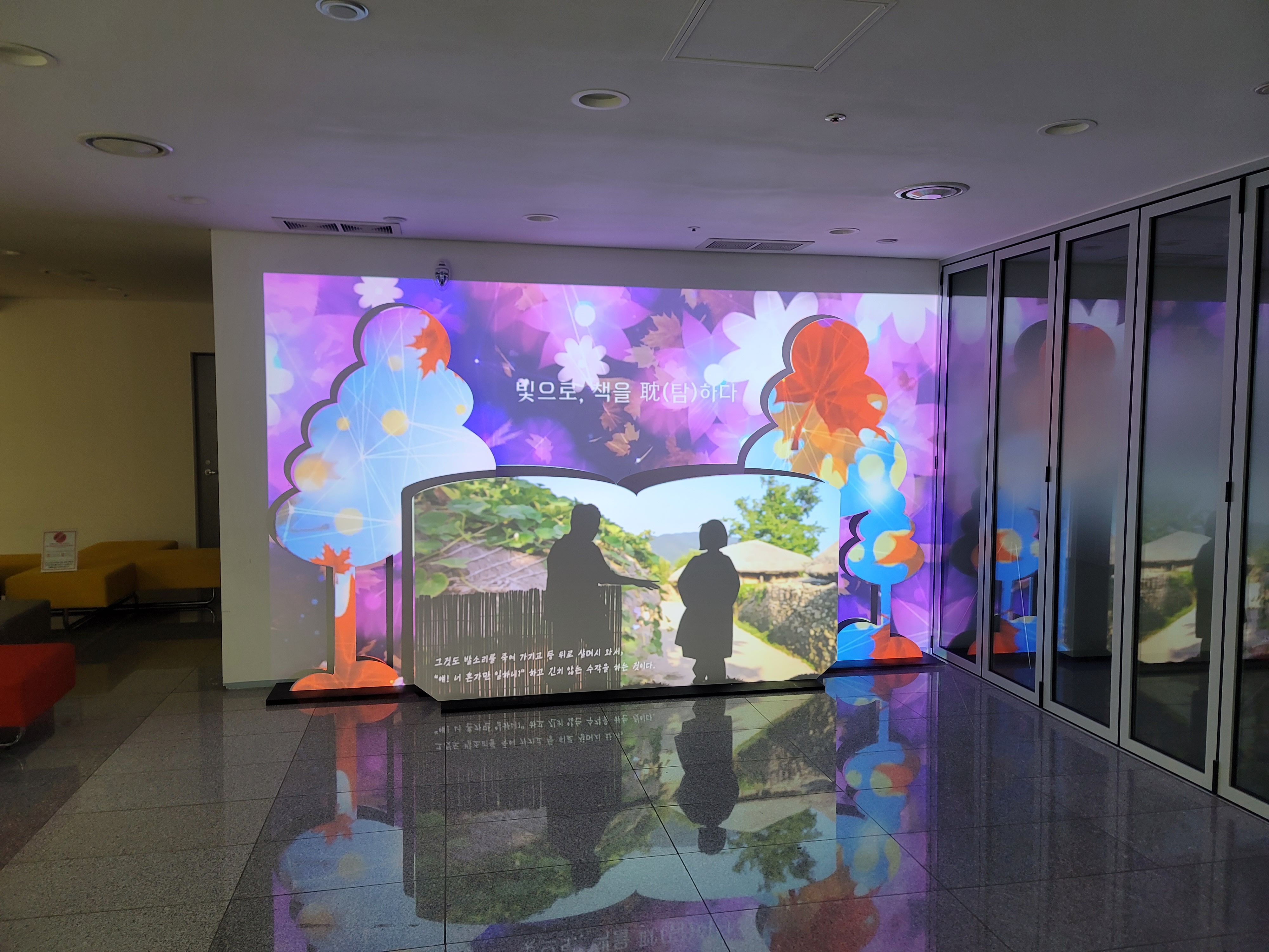 It's a new experience that brings modern and contemporary Korean literature to life with colorful light and video. At the center of the exhibition are three short stories, "Rain Showers" by Hwang Soon-won, "Camellia" by Kim Yoo-jung, and "Lucky Day" by Hyun Jin-gun, that capture key moments in Korean modern and contemporary literature. Several parts of the artwork, which is composed of Korean images, were created using artificial intelligence-generated models.