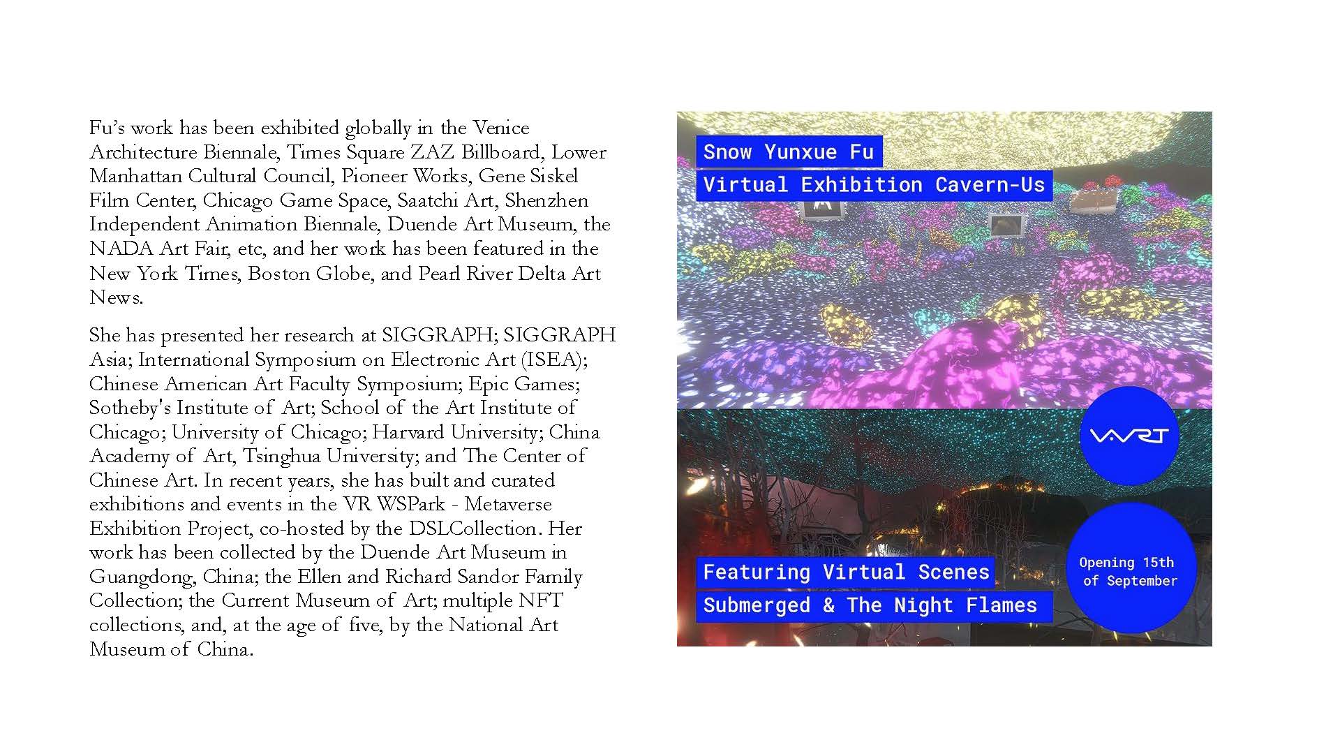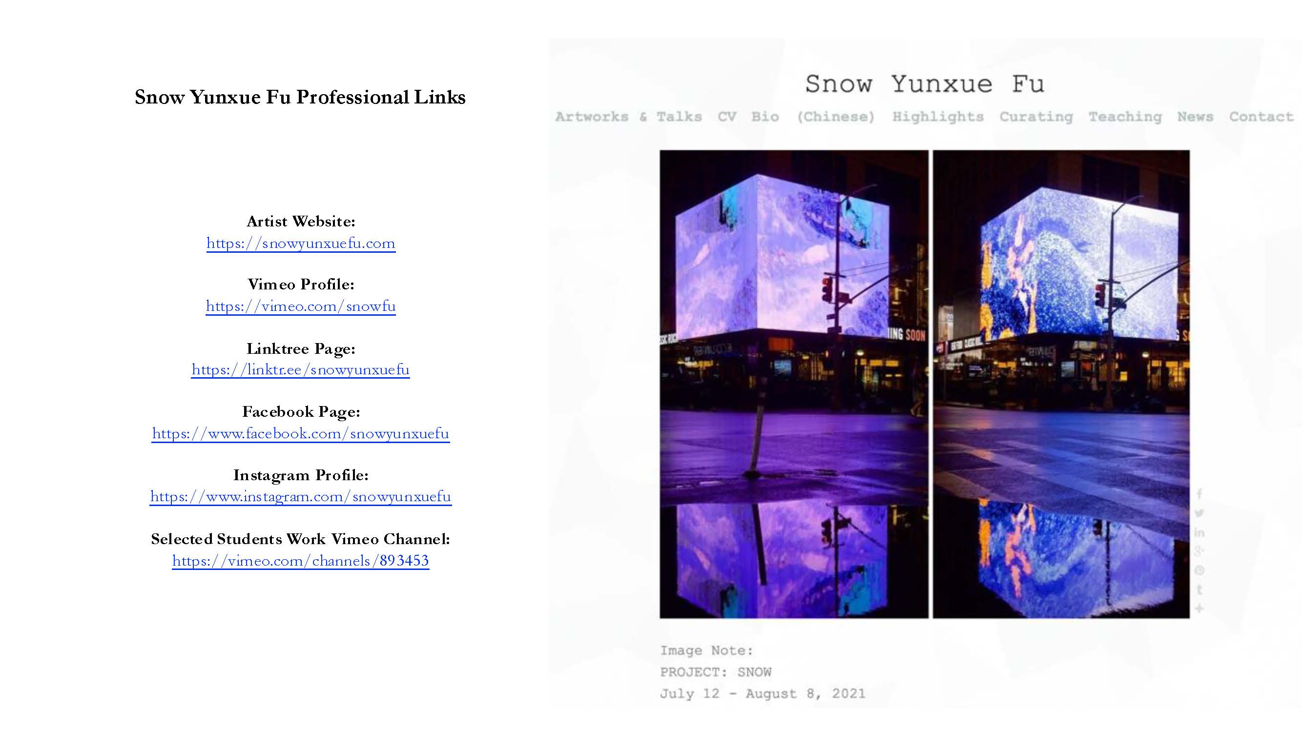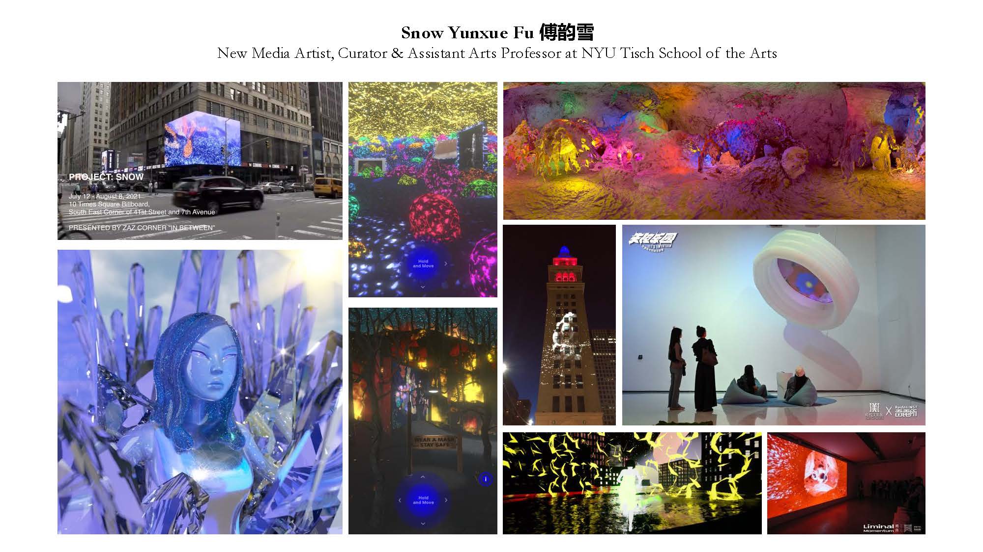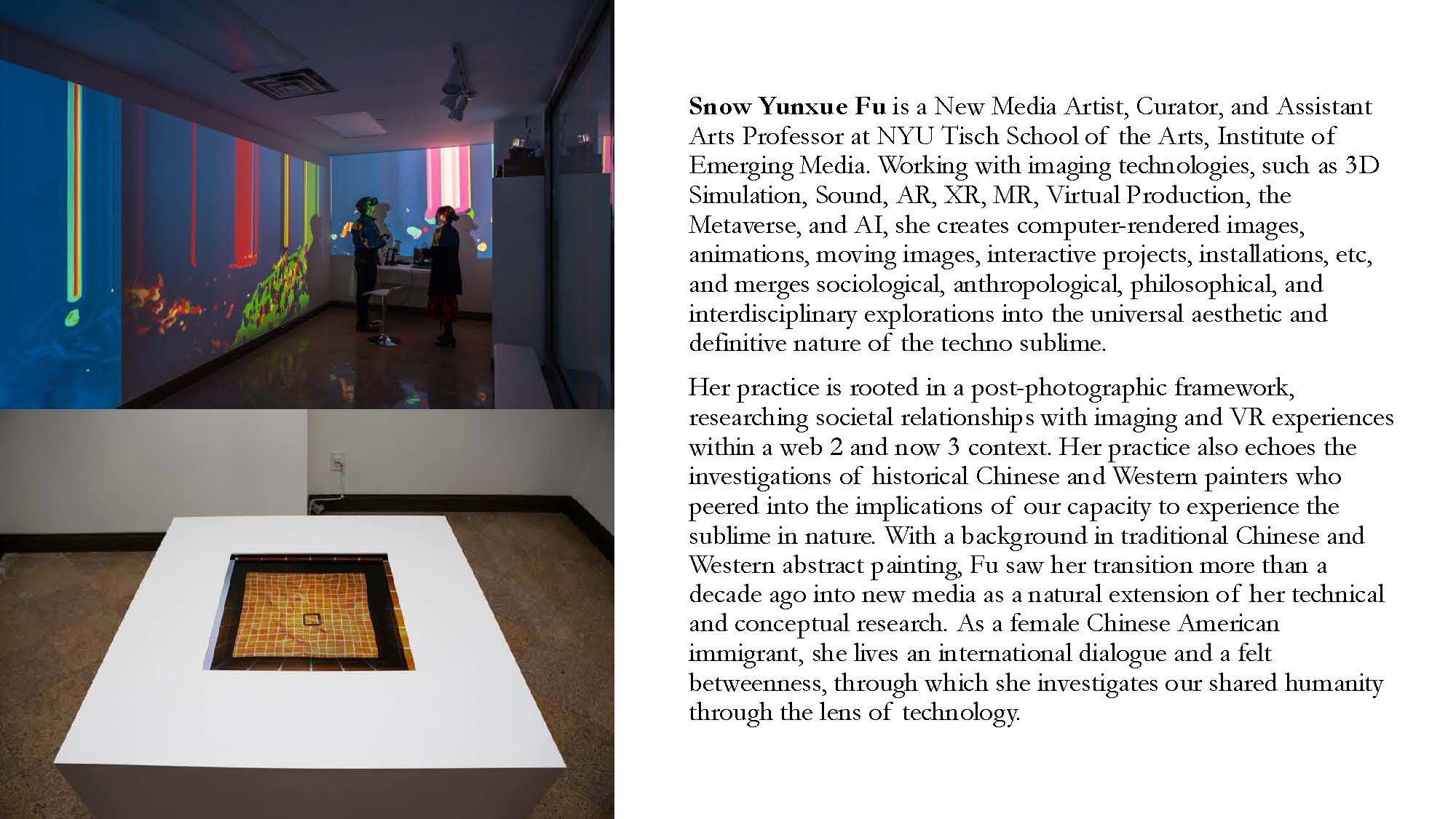 Snow Yunxue Fu is a New York based New Media Artist, Curator, and Assistant Arts Professor at New York University (NYU) Tisch School of the Arts, Institute of Emerging Media. Working with imaging technologies, such as 3D Simulation, AR, XR, Metaverse, Virtual Production, and AI, she creates computer-rendered images, moving images, interactive projects, installations, etc, and merges sociological, anthropological, philosophical, and interdisciplinary explorations into the universal aesthetic and definitive nature of the techno sublime.