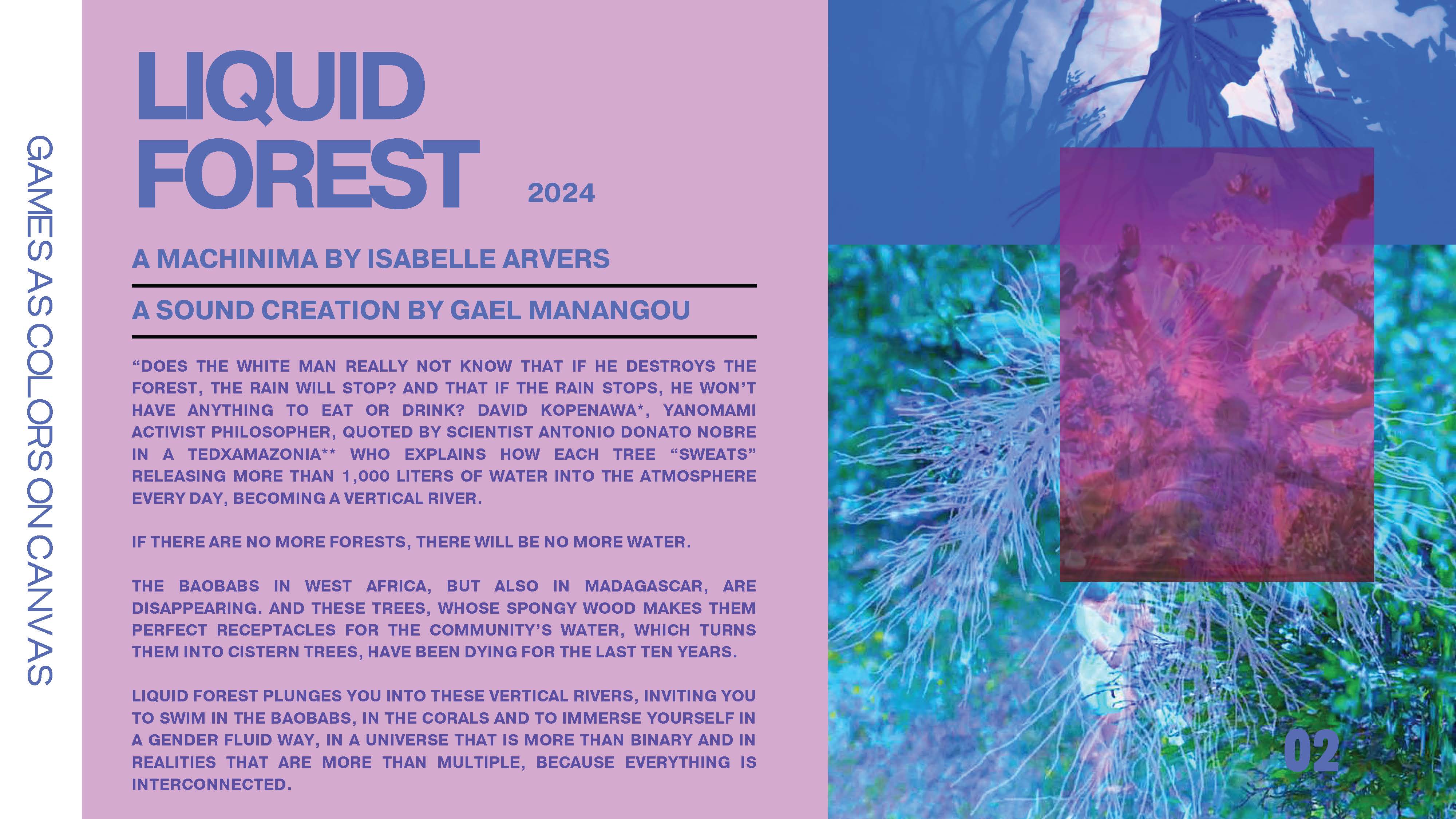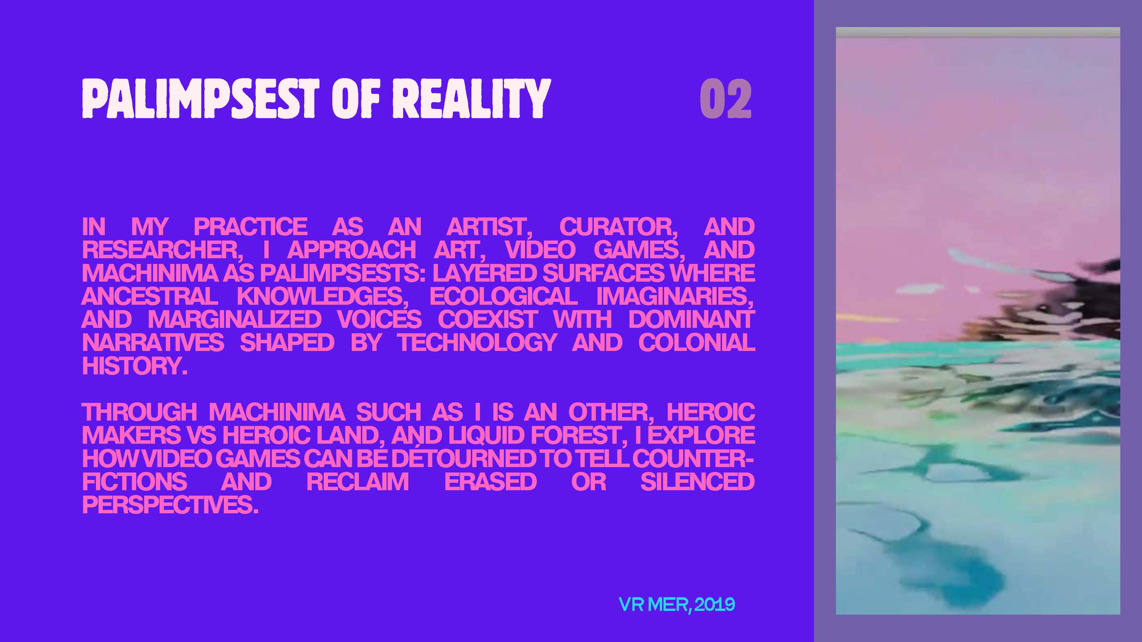 Through machinima such as "I is an Other," "Heroic Makers vs Heroic Land," and "Liquid Forest," I explore how video games can be détourned to tell counter fictions and reclaim erased or silenced perspectives. As a curator of exhibitions such as Aux Futurs Ancestraux and initiator of collaborative projects like Beyond Green Games, I work with artists and communities across the Souths to re-inscribe suppressed cultural, queer, and feminist narratives into contemporary digital art.